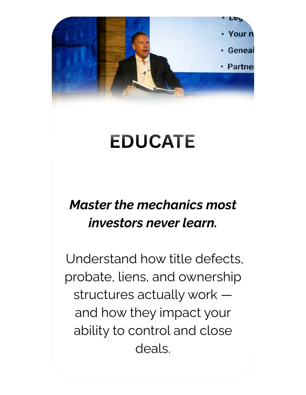 Curative Title Conference was built for investors who want to operate at a higher level — mastering the title, probate, and ownership complexities that determine whether a deal gets solved, structured, and closed.